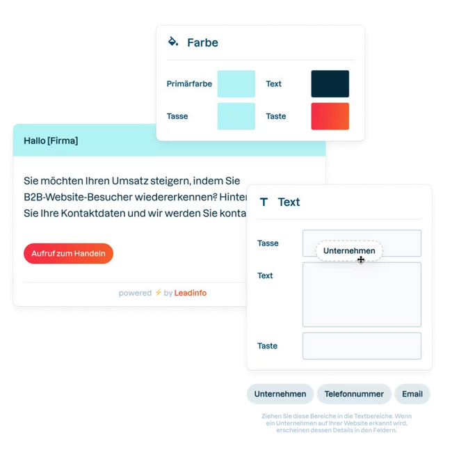Durch die Erkennung des Unternehmens ist Leadinfo in der Lage ein personalisiertes Formular zu erzeugen. Erstellen Sie zur Ansprache Ihrer Interessenten ganz einfach per Drag & Drop eine persönliche Ansprache. Leadinfo verwendet dann automatisiert die Daten zur Ansprache und schafft somit ein persönliches Besuchserlebnis für den Interessenten.