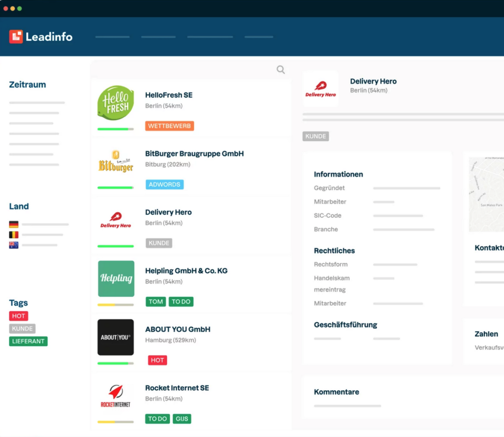 Ihre Webseite ist die Präsenz Ihres Unternehmens im Web. Gelangt ein Besucher hierher, so informiert er sich über Ihre Dienstleistungen, Produkte und über das Unternehmen. Mit Leadinfo erkennen, Sie welches Unternehmen sich für Ihr Unternehmen interessiert. Nutzen Sie dieses Wissen zu Ihrem strategischen Vorteil im Vertrieb und sprechen Sie Ihre Besucher direkt an.